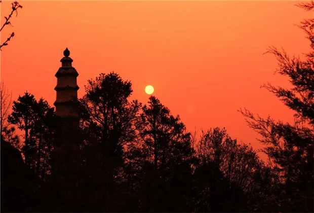 如閑暇之日,偶然居于山中寺內,聽晨鐘暮鼓,賞晚霞映塔,在燦若錦緞的霞光中,坐落在玉峰寺高處的北塔沐浴在光線里,與不遠處的南塔呼應而立,猶如兩位胸懷抱負的有志之士,挺拔站立,彼此遠望,心意相通,驀然想起李白的詩句“眾鳥高飛盡,孤云獨去閑。相看兩不厭,只有敬亭山。”