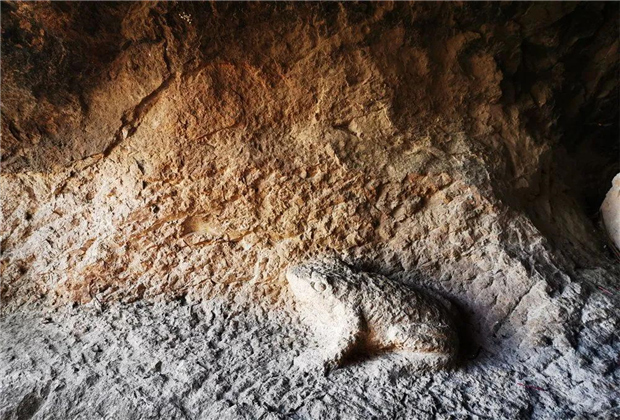 崖壁上還有一些從高處往下鑿開的深淺不一的石溝,每一條石溝的低端會有一個石槽。我猜測,估計是當年建造廟宇的工匠的奇思妙想:在崖壁上鑿開一條水溝,既可以避免下雨時造成建筑浸水,還可以在石槽里收集難得的雨水,以備用時所需。工匠們的精心設計應該在很長時間里保住了廟宇的安全,卻無法預測后人因各種原因沒有保護好這巧妙的“懸空寺”,實在是九鼎山大大的遺憾。