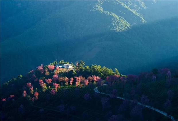 而這山也是極襯這花的。無(wú)量山雄奇又不失溫潤(rùn)秀麗,絲絲縷縷的霧氣不時(shí)自山麓間飄來(lái),綿延的茶樹(shù)在冬日依舊綠意盎然。千山一碧、云飄霧繞,無(wú)量山宛若一塊巨大的臺(tái)幕,盡心襯托著冬櫻的光芒四射。