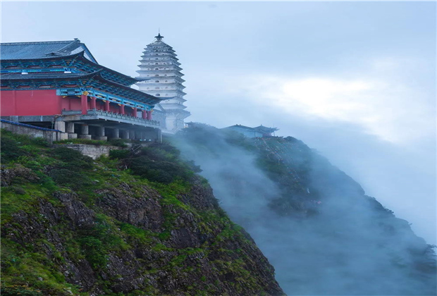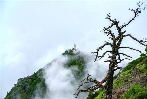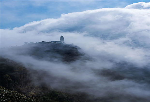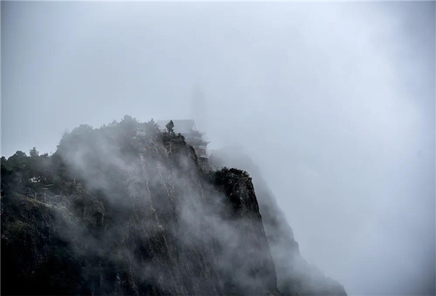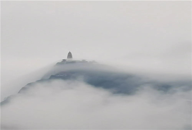 蒙蒙細雨下,青翠蔥蘢的雞足山云霧繚繞,或輕飄漫舞,或怒濤排空,仙氣氤氳,霧在山中游,山在霧中行,儼然一副潑墨山水畫。