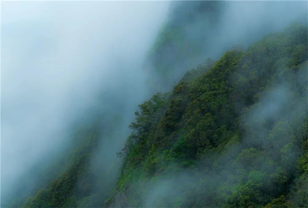 待秋雨初歇,跌巖起伏的山巒若隱若現,像極了珠紗遮面的絕世佳人,猶抱琵琶半遮面,神秘且悠遠。