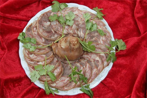 每一只彌渡卷蹄,形似豬蹄,其中實際包含了細嫩的里脊肉和精瘦的豬后腿肉。將這兩種肉佐以白酒、草果、茴香等香料腌制,塞入去骨的豬腳中,用稻草緊緊綁住,煮熟后腌制一月即可。由于腌制時間不長,鹽味適中,彌渡卷蹄一般用切片擺盤的方式上桌,配以蘸水,當做涼菜食用。