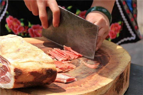 諾鄧火腿的特殊,從它的腌制材料開始。腿,要選當?shù)睾谪i最肥的后腿;腌制的鹽,要用當?shù)毓披}井采鹵熬制出的鹽;腌制時,一定要晾曬在冬無嚴寒、夏無酷暑的諾鄧村中,這樣腌制出的諾鄧火腿,鹽味適中,還能直接生吃,別有一番鮮甜風味。