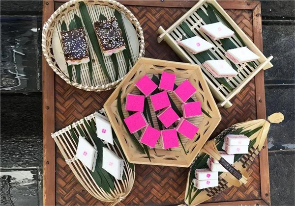 打開鶴慶的米糕蒸籠,在騰騰熱氣中,一塊塊菱形米糕散發(fā)出誘人的米香。鶴慶的米糕分為水糕和干糕,其中干糕中的夾層糕猶具特色,其形狀呈菱形,中間夾有紅糖、薄荷、橙皮、棗泥、龍眼等混合而成的餡層,吃起來細膩而香甜。