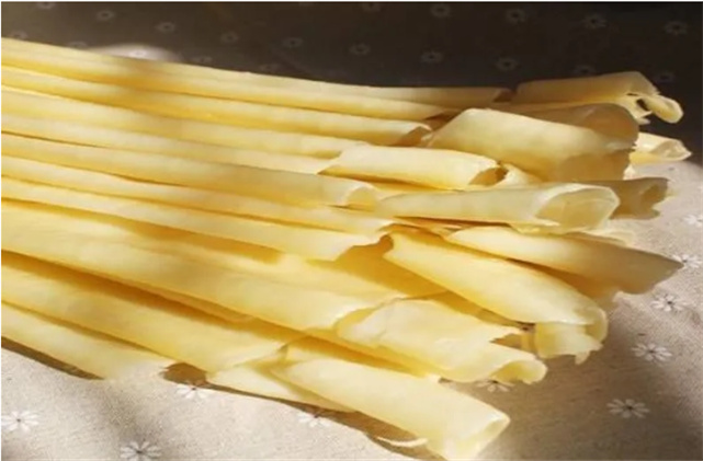 乳扇是以優(yōu)質鮮牛奶為原料,混合三比一的食用酸漿加熱煉制凝結,制為薄片,纏繞于細竿上晾干而成,因狀如折扇而得名。乳扇營養(yǎng)價值高、醇香可口,吃法也是各式各樣,生吃、干吃、油炸、煎烤,還可以做成甜點。生吃:如果是剛制作好不久的新鮮乳扇,可以不做任何加工,直接生吃,味道油而不膩,鮮醇清香,原汁原味,還不上火。