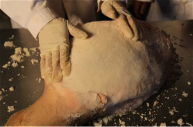諾鄧火腿制作技藝主要包括選料、修割定形、晾干除水、排血、灑酒除菌、拍壓上鹽、腌制、上鹽泥、發酵、風干等程序。