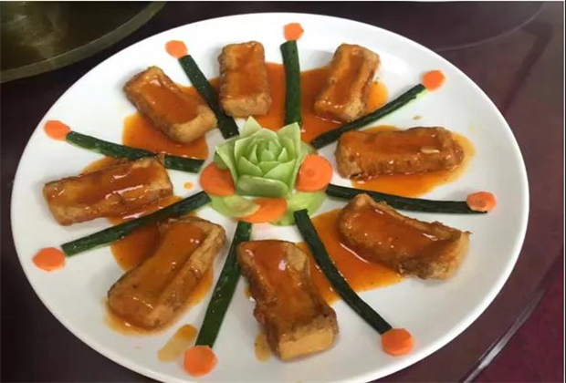 古道飯莊以白豆腐、臭豆腐作為原材料,經過不同的烹飪方法及多種多樣的造型設計,推出了瓦片豆腐、鐵板豆腐、開心豆腐、脆皮豆腐、鍋塌豆腐、果汁豆腐等多種菜品,讓一道道豆腐菜迸發出全新的味道。