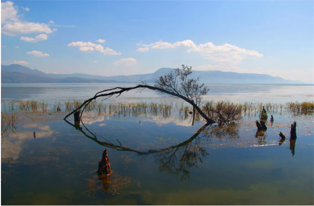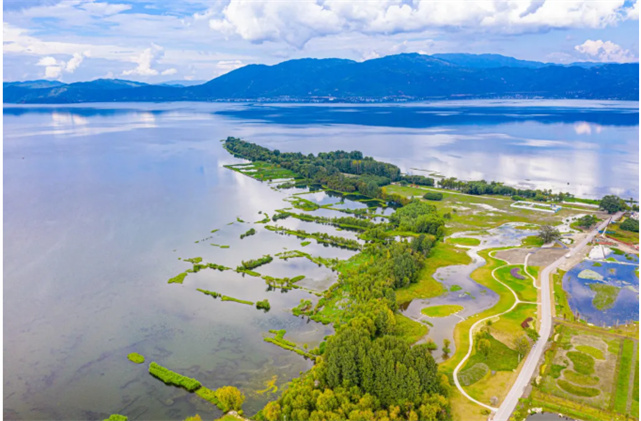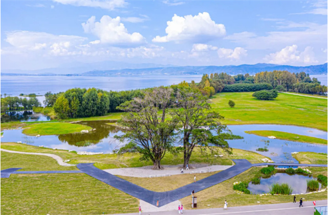 從喜洲出發,穿過蜿蜒的村道,10分鐘車程就可以到達洱海邊,在這里有個因形似舌頭而得名的濕地公園。