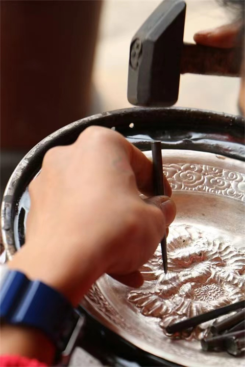 早在唐朝南詔時期,這里就有人從事金、銀、銅器手工加工工藝,現已有一千多年的歷史,銀器加工技藝聲名遠揚。鶴慶新華村的銀匠們,常年游歷,學習各地銀飾、銀器文化,提高自身的銀器加工制作技藝,秉持“千錘百鏨、守正創新”理念,精心打造民族手工藝特色產業集群,實現“前店后坊、產供銷一條龍”的生產經營格局。如今,涌現出了一批如寸發標、母炳林等“新華銀匠”一樣的杰出代表人物,他們的作品也成為了當地的一張靚麗的民族文化名片。