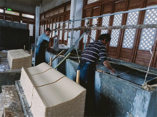 此外,白棉紙體驗作為鶴慶新華銀器小鎮的另一個新業態,深受游客的喜愛。游客可以去鶴慶白族手工白棉紙傳承體驗中心體驗紙漿變紙張的神奇過程。撈紙師傅說:“傳統的白棉紙用的是構皮純手工制成,后來也有人添加過黃麻。撈紙漿的時候,越柔韌越好,技術好的師傅能把紙做得很均勻,很薄又不失韌性。等白棉紙制成以后主要是用于茶葉包裝、甲馬紙等。”摸著柔軟且有質感的白棉紙,你不得不被神奇的造紙技藝所折服。
