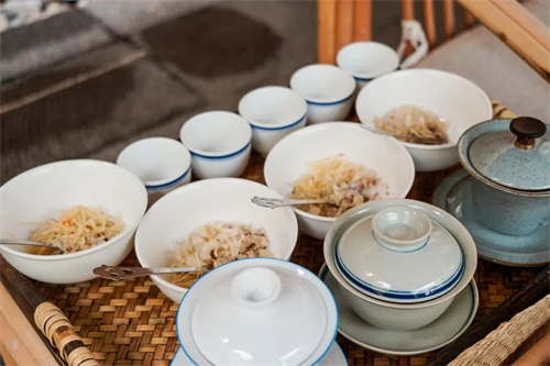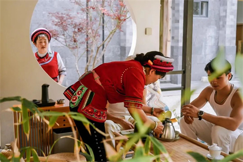 在匠廬·蜜灣的庭院內,我們準備了白族待客的茶禮“三道茶”,寓意人生“一苦、二甜、三回味”。第三道茶最讓人印象深刻,茶盅中放的原料換成了蜂蜜、炒米花、花椒、核桃片,趁熱飲下,喝起來甜、酸、苦、辣,各味俱全,回味無窮。