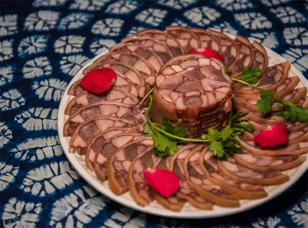 彌渡卷蹄是彌渡特有的傳統手工技藝發酵肉制品。將豬蹄拔毛洗凈、剔骨,將肉切成條塊狀,加入彌渡特有的紅粬米和草果、食鹽等腌制,腌好的肉條塞進豬腳,用稻草扎緊后,煮熟腌制而成,因成品形同新鮮的豬腳,故而得名。早在明朝時期,彌渡卷蹄就被列為宮廷名菜,有“500年一種吃法”的美譽。其色澤紅白透明,肉質鮮嫩,肉香濃郁,食而不膩,冷吃或熱食皆美味可口。