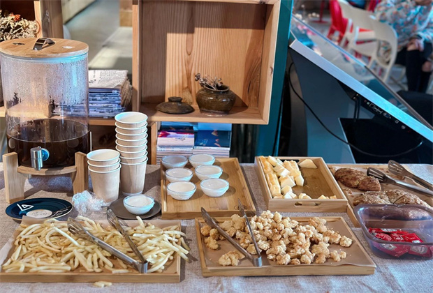 辛苦勞作后的美食,往往更誘人。工作人員準備了紅糖姜茶、薯條、雞米花、水果,還有農耕館的特色“喜米布丁”。小朋友們在工作人員的指引下有序的領取餐食。