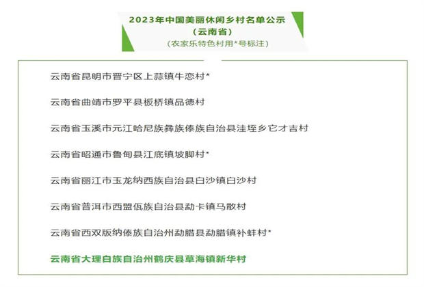 8月25日,農(nóng)業(yè)農(nóng)村部鄉(xiāng)村發(fā)展司發(fā)布了《2023年中國(guó)美麗休閑鄉(xiāng)村名單公示》,共有256個(gè)村落擬入選2023年中國(guó)美麗休閑鄉(xiāng)村名單。其中,云南省共有8個(gè)村落擬入選,大理州鶴慶縣草海鎮(zhèn)新華村位列其中。