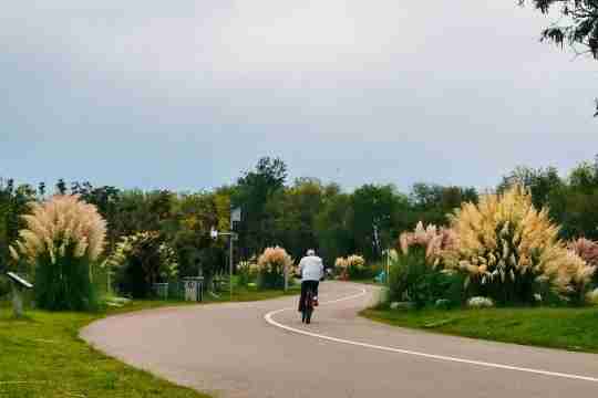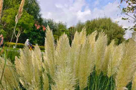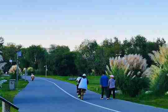 人們伴著荻花騎行鍛煉
