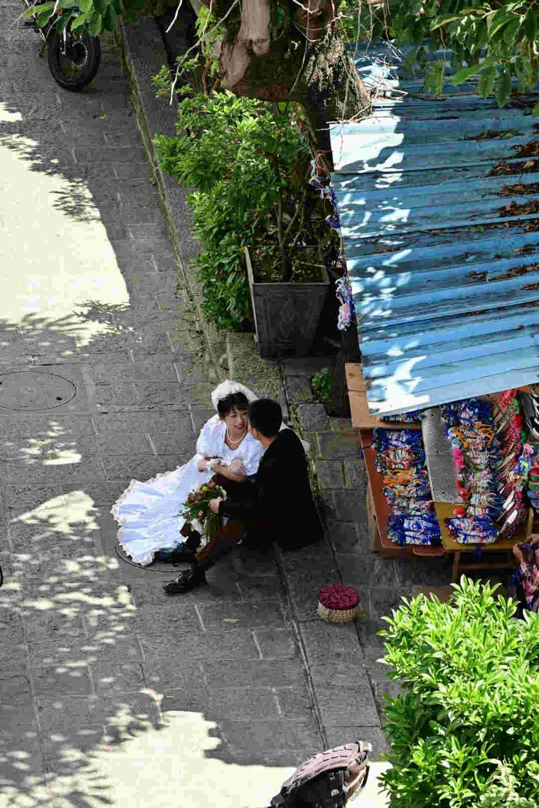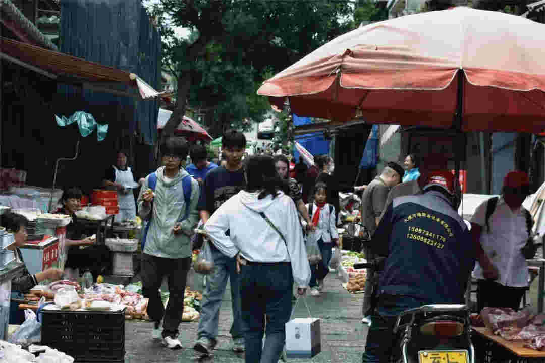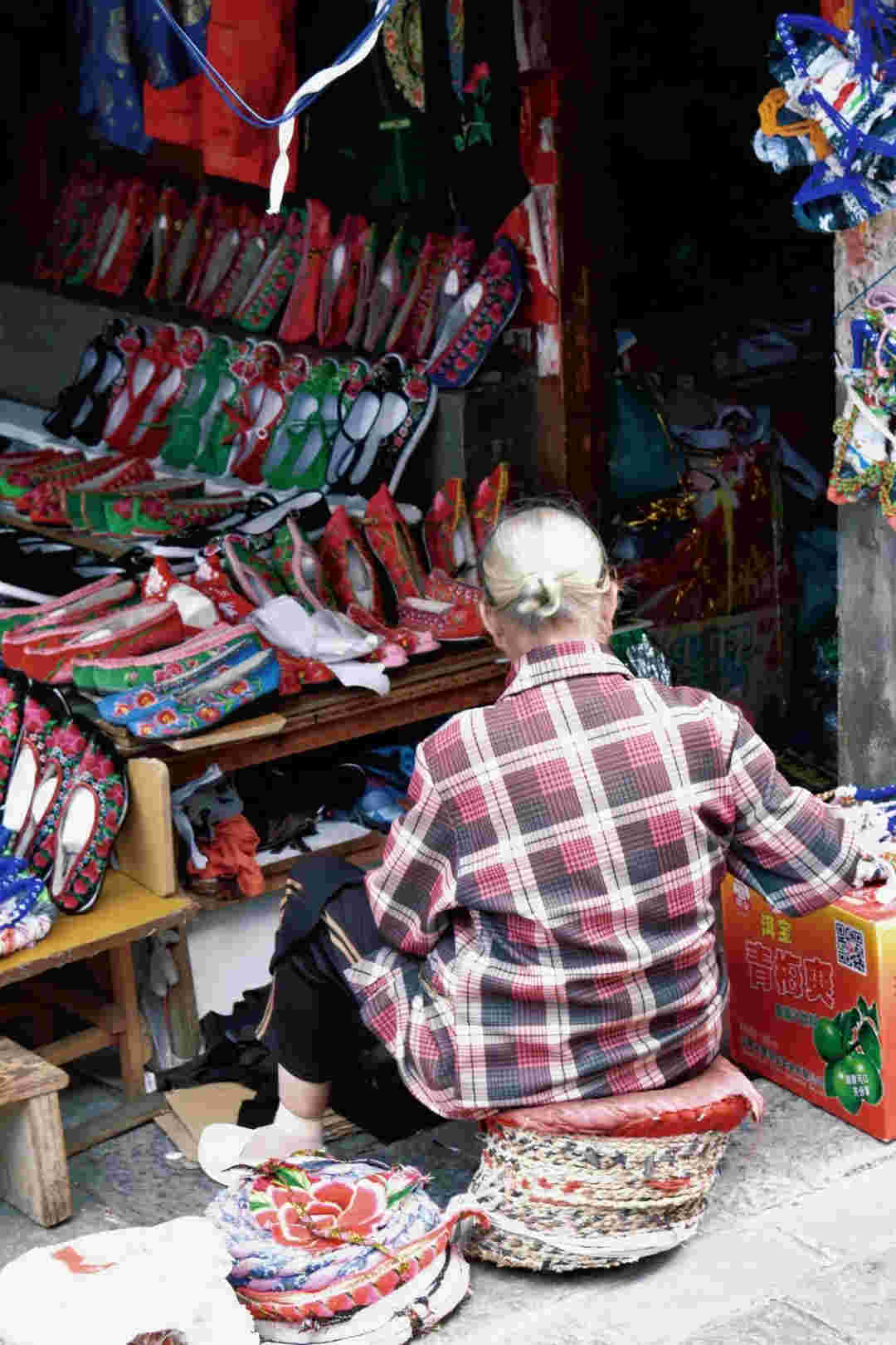 嬢嬢自己手作的米糕熱氣騰騰,蒸起誘人清香。路邊的柿子圓潤飽滿,在竹籃里被擺得整整齊齊,阿嬢說,這是她自家的柿子樹結的果子。一棟棟有年代感的陳舊老民居前,是一個又一個最簡單接地氣的攤販。白族阿姐一面趁著明媚陽光刺繡,一面照看著自家的醬料攤。老人縫著繡花鞋,花團錦簇中,絲絲縷縷繞不開一代人的生活與情懷。