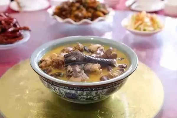 洱源山水秀美,溫泉星羅棋布,有著“溫泉之鄉”的美譽,這里的溫泉燉雞堪稱一絕。在制作溫泉燉雞的過程中,將雞清洗干凈后,配以鮮豬油、草果、木瓜絲、姜絲等佐料,放入陶罐中,不盛水并密封罐口,再放入硫磺泉中燉煮。隨后從泉水中取出的溫泉燉雞骨肉分離、肉質鮮美、香味撲鼻,若加上三七、蟲草、天麻等名貴藥材燉煮,更是一道難得的滋補佳肴。