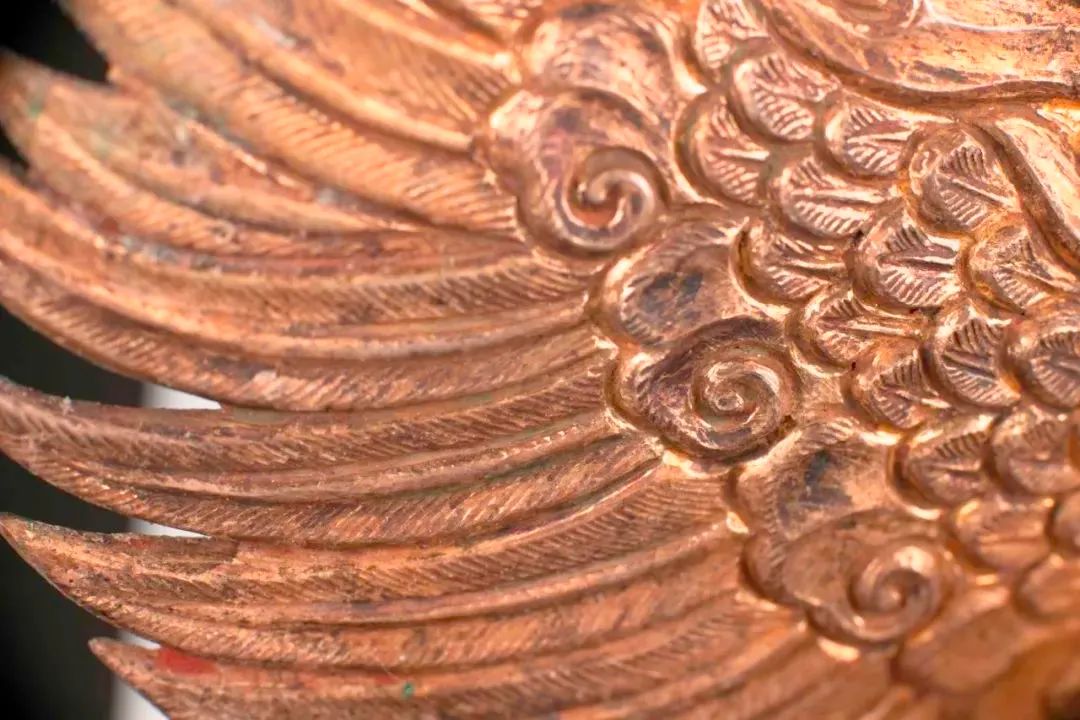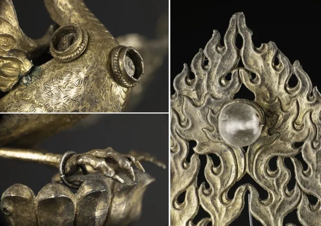 金翅鳥頭戴羽冠,身后有火焰形背光,鑲嵌了五顆水晶珠,雙翅張開并向內卷仿佛展翅欲飛。兩只鋒利的爪子抓在蓮座上,雄健而兇猛。這復雜而精美的制作工藝,不僅體現了工匠的高超技藝,也將金翅鳥這一神秘形象完美地呈現在人們面前。