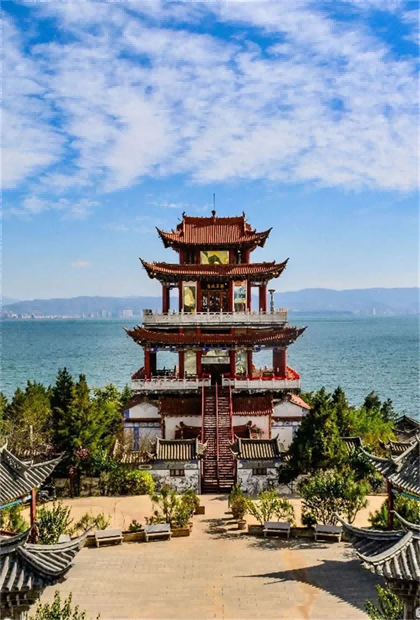 在大理這片東方瑞士的土地上,有一處隱藏在洱海東部的小島,如同一顆明珠鑲嵌在碧波之中,它就是洱海小普陀。這個小小的石灰巖島,如同一首古老的詩歌,訴說著大理的歷史、信仰和自然之美。當船只緩緩駛向小普陀,好像越了時光的長河,來到一個充滿神秘和傳奇的世界。小島如一顆微小的心臟,跳動著洱海的生命之源。碧綠的海水在岸邊輕輕拍打,撫慰著疲憊的心靈。遠處的蒼山若隱若現,如同巨龍騰飛,它是洱海的守護神,注視著這片湛藍的水域。小普陀島高出水面十來米,巖石如雕刻般奇妙,儼然是大自然的杰作。島上的樓閣建于明代,兩層歇山式的建筑在藍天白云的映襯下顯得格外莊重。第一層塑有如來,莊嚴肅穆;第二層塑有觀音,慈悲仁愛。這座小巧玲瓏的樓閣,神霧繚繞,如同仙境般令人陶醉。