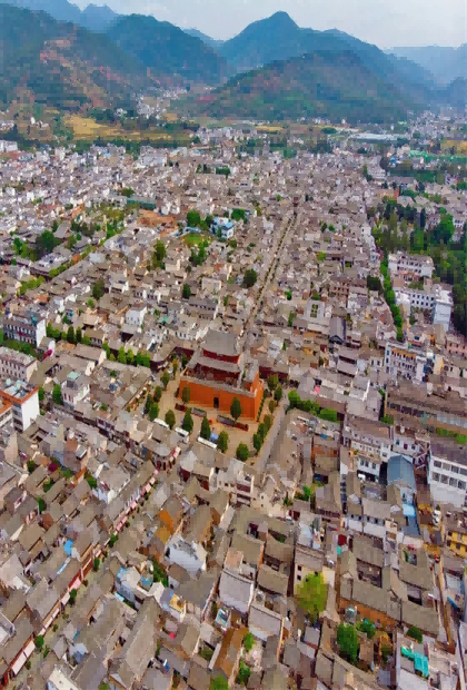 巍山古城:巍山古城內街道以拱城樓為中心,呈標準的井字結構建設,共有25條街道,18條巷,全長14千米,城內房屋基本保持了中式結構,南、北主軸線兩側的房屋則完整地保存了明、清時代的建筑式樣和風格。古城內的民居多數是院落式的,保持了大理白族的“三坊一照壁”“四合五天井”土木結構的特色,北門外的二條街道是主要居住區,臨街為鋪面及大門,寬度一般為67米,后面為住宅。巍山古城筑有城墻,東西南北四個城門,城中心建星拱樓,古城形方如印。古城里建有文廟和古城博物館,集中展示了“文獻民邦”和“民俗文化”的完美結合。在博物館以南,有古廟等覺寺。這座寺廟的大部分在清咸豐年間被毀,現僅存寺院外的雙塔和寺院內的太陽宮,后者始建于明永樂年,建筑單檐歇山頂,面闊五間,四周設廊,檐下施重昂斗拱,粗大古樸。
