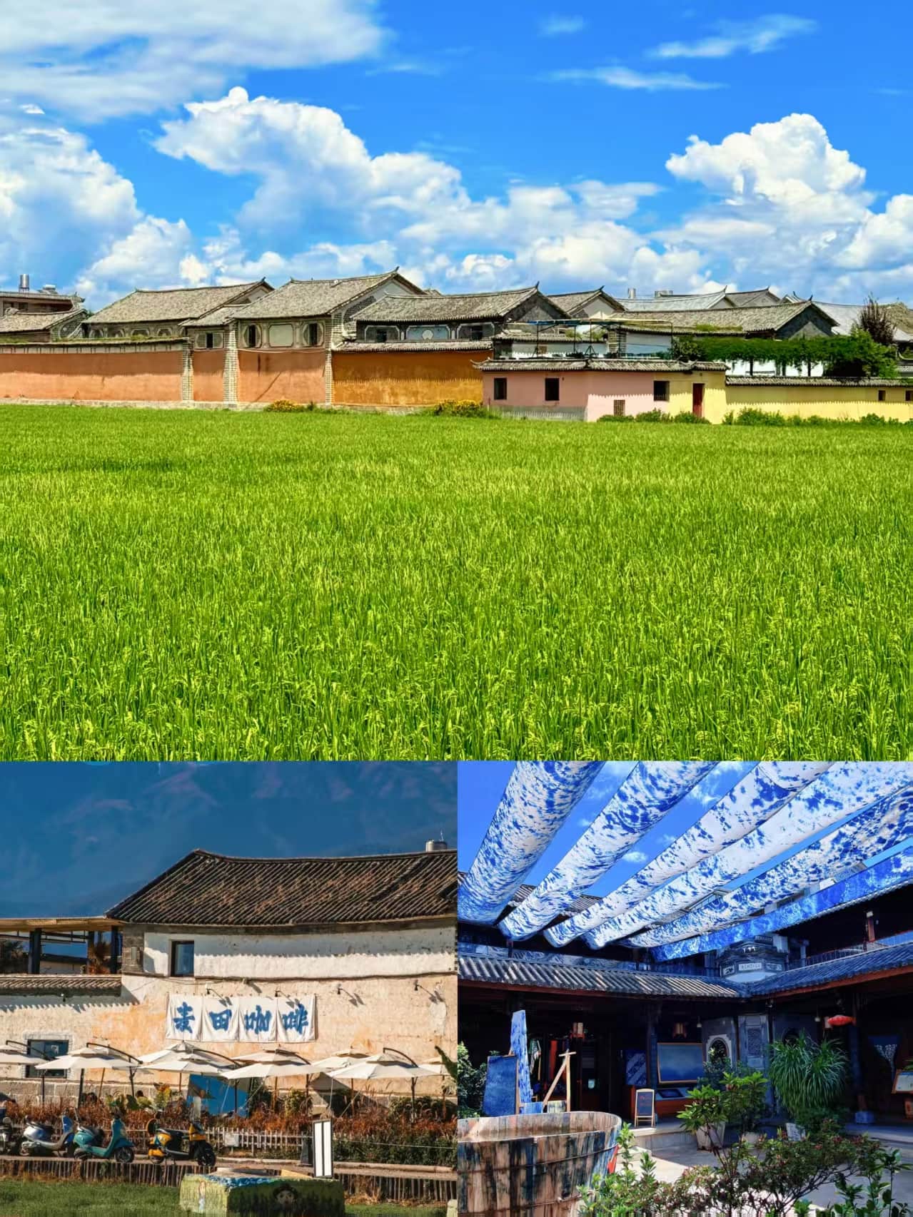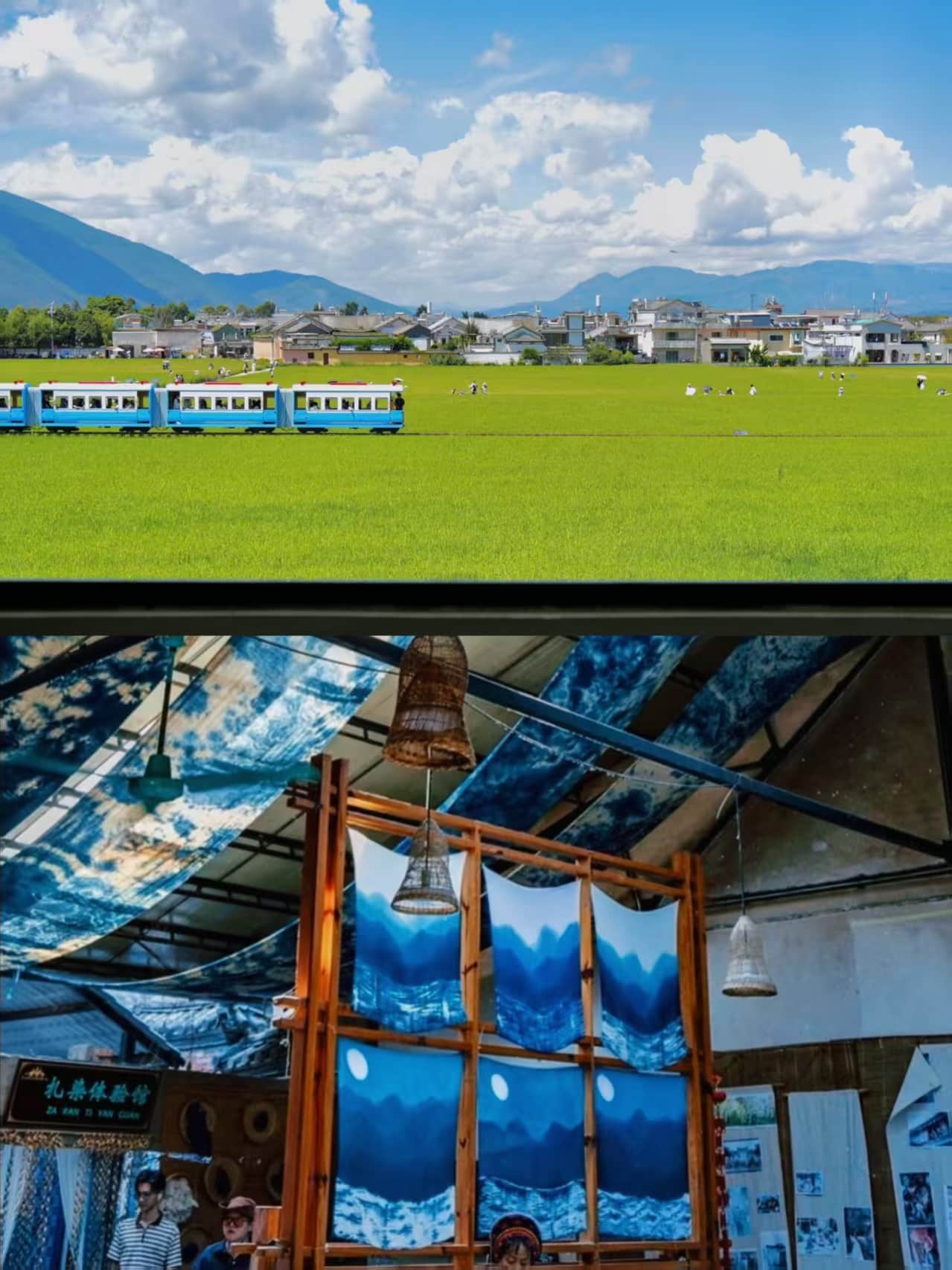 從大理古城向北22公里,喜洲古鎮(zhèn)以嚴家大院為代表的明清商幫建筑群,見證著茶馬古道的繁榮。這里的白族民居以“三坊一照壁”“四合五天井”為特色,雕梁畫棟間藏著白族匠人的智慧。而真正讓喜洲聲名遠播的,是國家級非遺——扎染。在璞真扎染博物館,游客可親手體驗用板藍根染布的古法技藝,將蒼山云霧、洱海波紋凝固成藍白相間的方巾。古鎮(zhèn)外的稻田里,小火車穿梭于金黃麥浪間,成為網(wǎng)紅打卡的“移動風景線”。