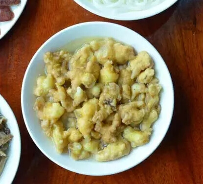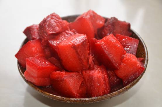 杉陽“土八碗”中的老大——紅肉,喜慶筵席上絕對少不了它的。美女們看著先別害怕,這四四方方紅得晶瑩透亮的肉肉,也許你吃了第一塊,還想吃第二塊。整桌菜品中,最代表喜慶的就是這碗用腿子肉做成的紅肉兒,肥肉多瘦肉少??上攵?,在那個葷腥大就代表生活水平高的年代,這道用紅色礦物質(zhì)“膏子”(俗稱“大紅”)點出來血紅油亮、大塊方正的豬肉讓人如何充滿食欲,吃起來又是如何過癮、滿足。