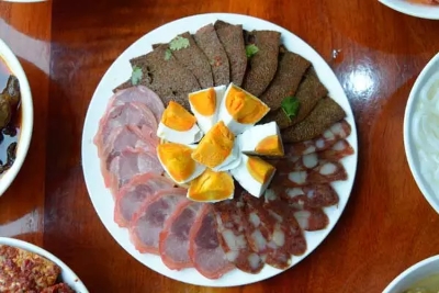 “杉陽土八碗”一般為:紅肉、酥肉、粉蒸千張、粉蒸排骨、腌菜肉、豆腐丸子、鹵肉、涼拌蘿卜絲這八個菜,有時也會根據(jù)季節(jié)的時令蔬菜進行調(diào)配。這八碗菜,每碗都以豬肉為主要食材,只不過用的是不同部位的豬肉,分別以蒸、煮、汆、鹵、炸等不同的烹飪方法制作出來,讓人從中品嘗到不同的豬肉味道。