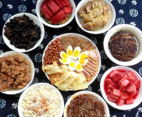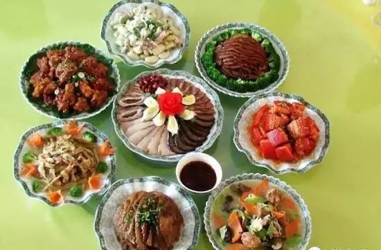 傳統(tǒng)的葷席八大碗,即紅肉、酥肉、粉蒸肉、千張肉、茶豆子、粉絲、木耳、豆腐皮春卷、百合加一個涼菜拼盤。