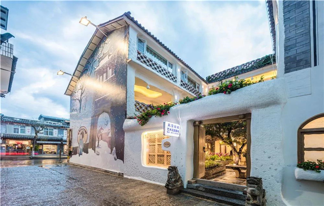沿著大理古城玉洱路款款前行,在一片青瓦白墻、錯落有致的白族建筑群中,一座小“圣托里尼”——風雪故城藝術花園客棧脫穎而出。