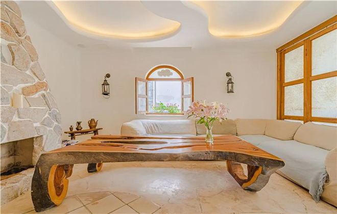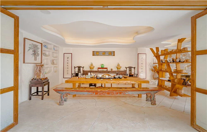 茶室內,只見左邊墻壁的鏤空洞穴里擺放著許多古玩茶具;靠窗的茶桌旁,布置一個大大的壁爐,風雪交加之際,當壁爐內燃起炭火,溫暖從腳邊升騰,直抵心尖。