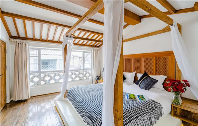 名為“南詔樂韻”的房間內,床頭擺放著一架歷史已久的古箏,桌上是一個大大的手鼓。尋一個秋冬的溫暖下午,隨意坐在榻榻米上,窗外金黃的銀杏葉伴著古樂聲輕舞飛揚,心中的萬千愁緒隨之化為青煙。