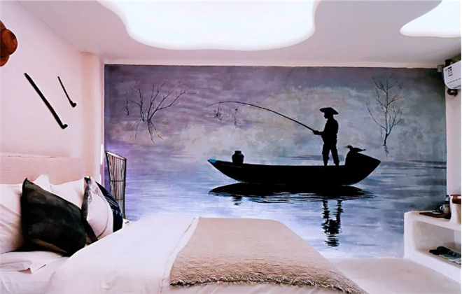 名為“漁歌唱晚”的房間內,一幅大大的洱海打漁壁畫上,漁夫正在垂釣。草帽、漁網、魚簍隨處可見,行走其間,洱海邊世世代代打漁人的打漁時光漸漸浮現。