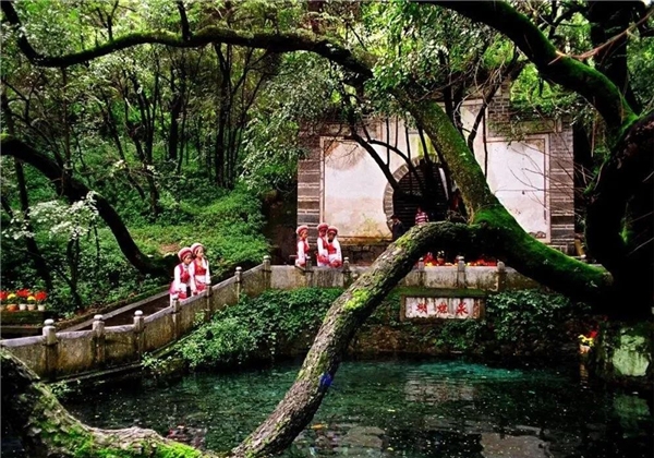 從泉底冒出,橫臥泉上的高大古樹便是合歡樹。合歡樹遒勁有力的樹干伏于泉水之上,似與泉水共纏綿。每年夏天,樹上淡黃色的花朵成片開放,遠遠望去,就像盤旋在枝頭的蝴蝶,蝶花相映,神秘動人。