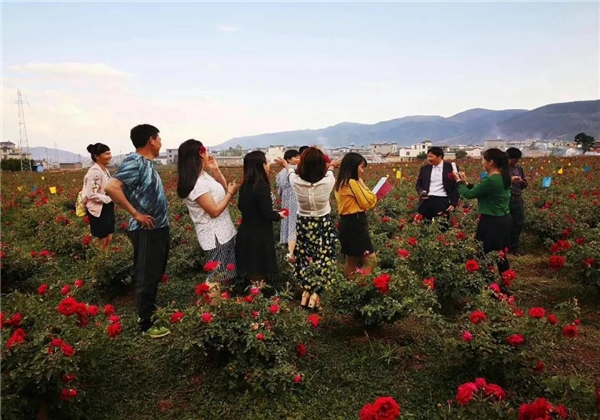 翻過定西嶺,站在后山坡,放眼彌渡壩,錦緞般的紅色彌漫150平方公里的彌渡壩子,整個(gè)彌渡壩一片紅彤彤。從坐落在紅巖赤水村的天天玫瑰園,到七彩云花玫瑰花莊園,再到賴龍食用玫瑰園等,成百上千畝規(guī)模化玫瑰園里的玫瑰花競相綻放,染紅了山嶺,染紅了村莊,染紅了大地。