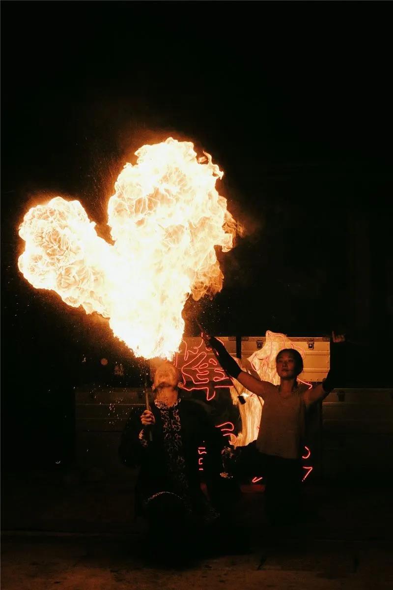 晚上七八點,集市就開始熱鬧起來,人們在各個攤位前停留穿梭,集市正中間,來自天南海北的多位火舞表演者正在盡情玩火,表演動靜結合,靜則剛,動則柔,變化萬千,視覺沖擊力極強,火力之強勁,引得在場觀眾紛紛駐足觀看,盡情喝彩,仿佛置身于野外的篝火晚會,將歡樂輻射到麋鹿星球的每一角。