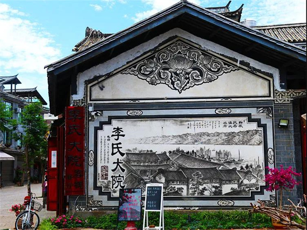 李氏大院是白族傳統民居“四合五天井”的典型建筑,有大門,后門,四方有四幢樓房合在一起,每兩幢房之間有一小天井,院心為大天井,共有五個天井,大門為三滴水造型,雕梁畫棟,飛檐翹角,彩畫以文房、詩書、花鳥、山水、蟲魚為主,充分體現房主人的意愿和家風。