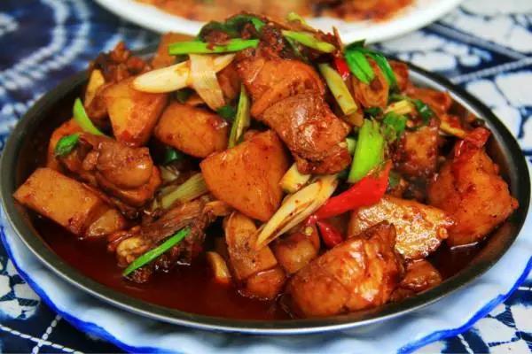 在當地大廚看來,做黃燜雞沒有什么訣竅,只需要兩個字:用心。雞選用永平當地的博南山土雞,堅持活雞現宰,剁成 2 厘米大小的方塊;然后將干辣椒去把、除籽,切成長節;注入鍋內的香油量要適中,將油燒熱,把花椒、姜、干辣椒放入鍋中炸成亮色,投入仔雞塊,加入適量的醬油、蔥、蒜等,翻炒幾下,蓋上鍋蓋,然后等待雞肉水分干而發黃,再放入自己調配好的佐料、蒜末和辣椒翻炒,最后加入適量大蔥便可起鍋;炒燜雞塊一定要掌握火候,只有用旺火炒后燜出來的才不會失去真味。