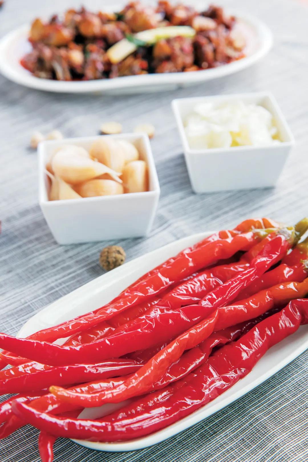 此外,傳統的黃燜雞,還配有泡大蒜、泡辣椒和苦菜湯,用以解油膩。一口咬下去,香辣爽口,心神俱暢。
