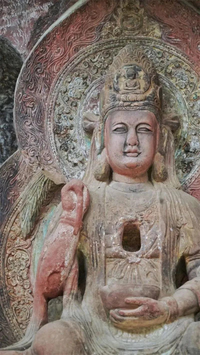 石像邊寫著警示:不準潑香油。細看一下,雕像及周圍果然有深色的油漬。看護石窟的工作人員解釋,當地民眾至今仍有潑油祈福的習俗,據說這么做能求子。