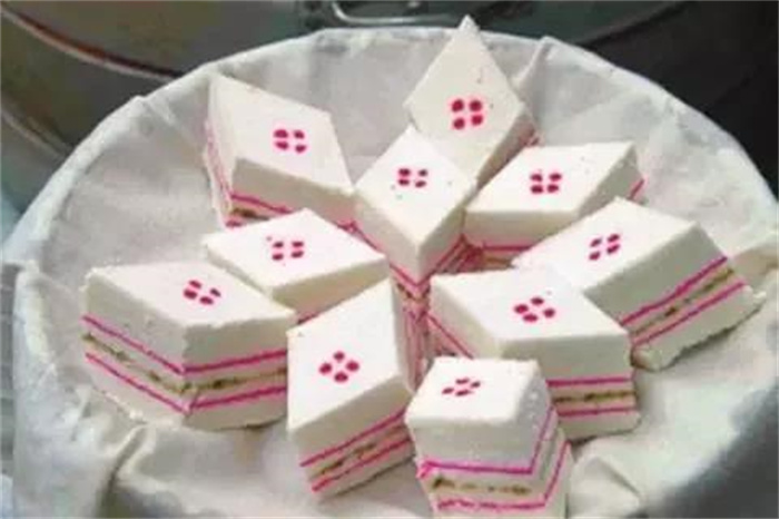 先將上等白米泡軟后,壓磨成粉,然后用薄荷、橙皮汁加紅糖將粉碾細,用細篩篩入甑子內,再用薄刀小心劃成長2寸、高1.5寸、厚0.5寸的小塊,用大火蒸熟。