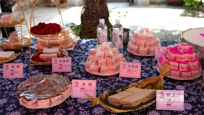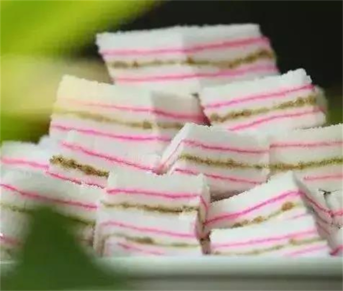 色糕呈正方形,中間有紅色腰線,表面為紅色罩面,紅白分明,質細而美觀。