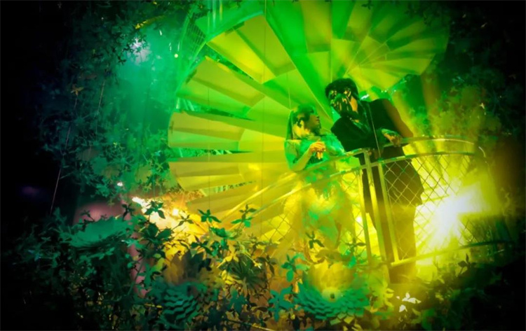 戲劇體驗通道分為A線和B線。A線以完美女王和平凡男孩阿t的愛情故事為主線,唯美浪漫;B線解密圖靈教授的內心和隱秘,充滿反轉和沖突。3500平方米的老廠房,以“變壓”為創意進行改造,形成了具有沖擊力的情緒酒吧、欲望花園、秘密試驗場與心音嗨場四大主題空間,整個變壓工廠都是《幻境2099》的舞臺。
